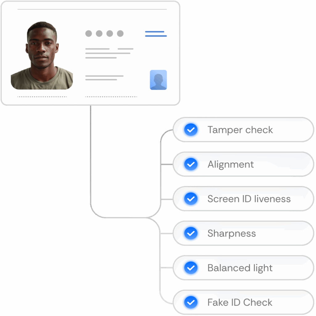Our liveness detection technology ensures people and documents are real, not photos or copies, and detects inconsistencies in reflections, screen artifacts, and micro-textures.