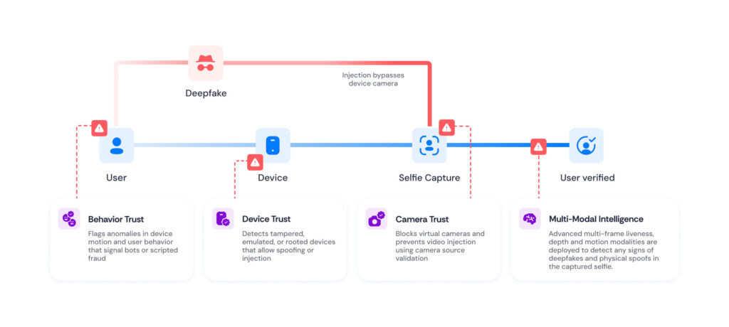AI-generated deepfakes and advanced digital manipulation techniques. Digital attacks attempt to bypass identity verification software using digital manipulation, including AI-generated deepfakes.