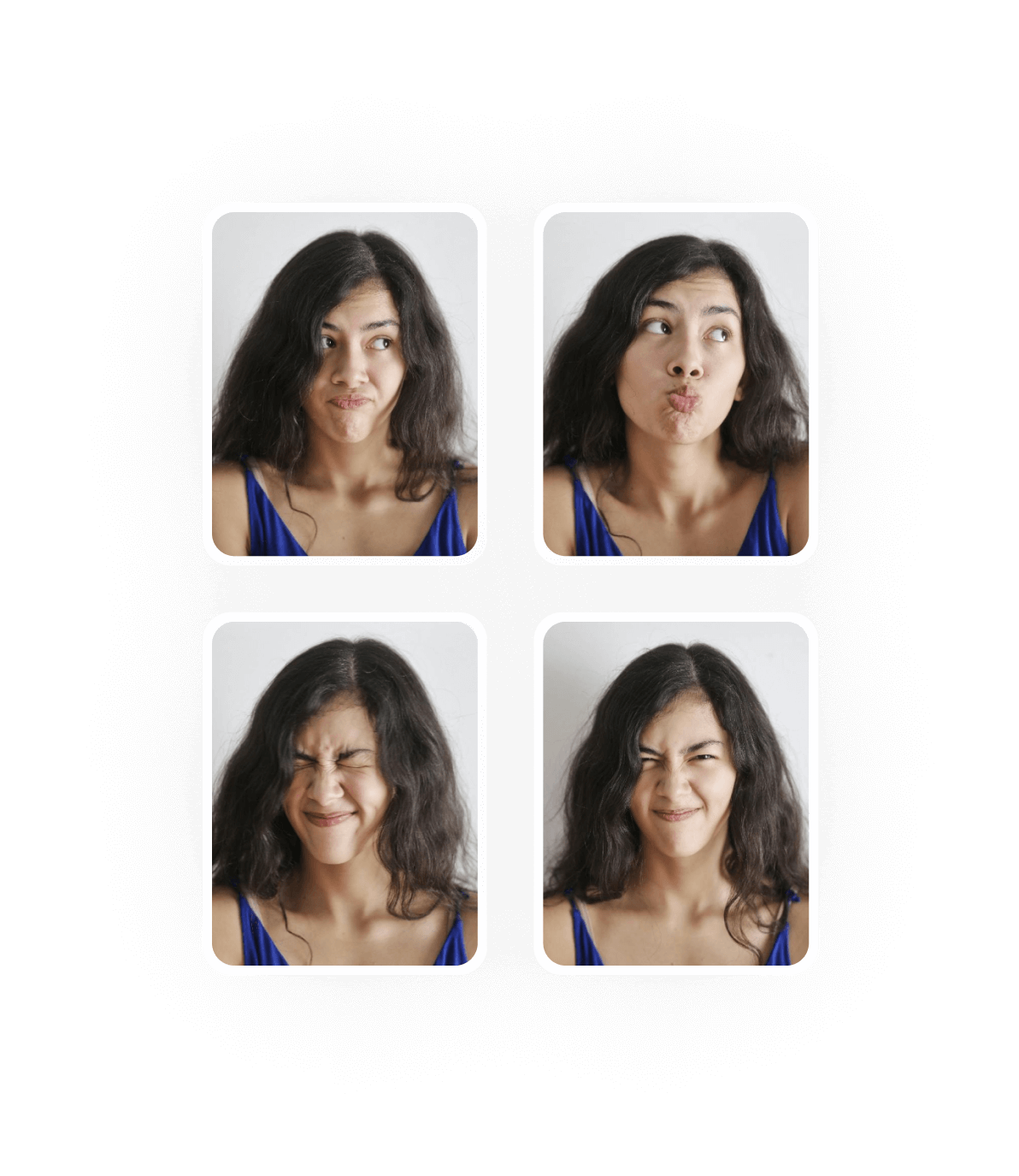 Overly dramatic facial movements, like extreme smiles or wide eyes, are used to distort the face and confuse recognition systems