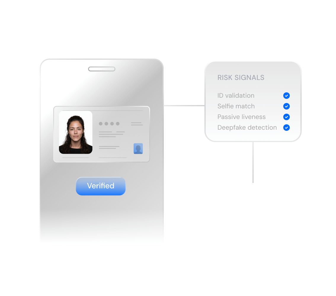 Includes government ID validation, selfie match, passive liveness, and deepfake detection.