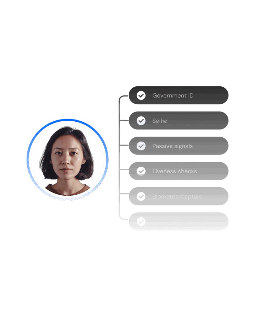 Multiple ways to verify identity (government ID, selfies, passive signals, liveness checks) with workflows that adapt based on risk level.